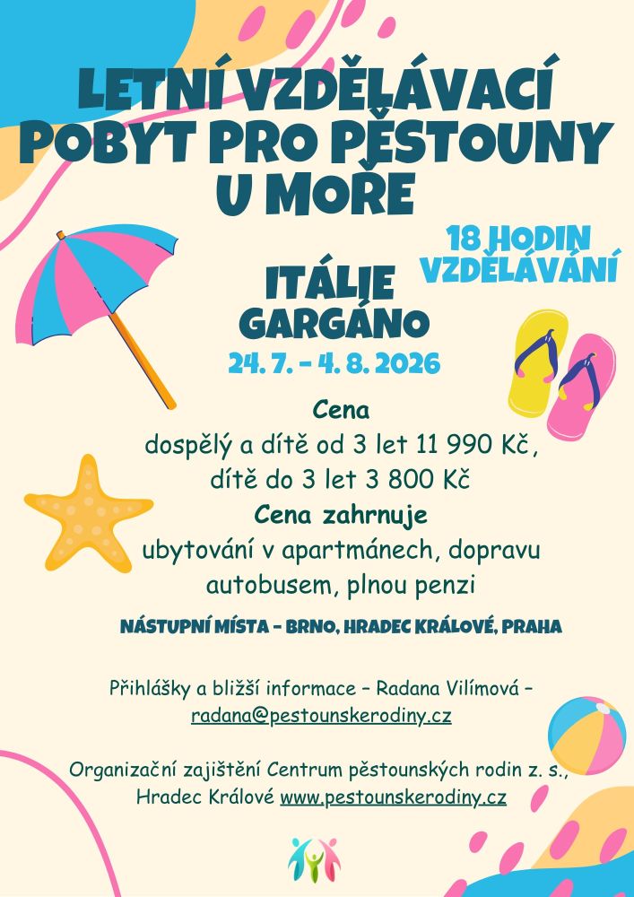 24. 7. - 4. 8. 2026 - Itálie, Gargáno - 18 hodin vzdělávání - hlásit se můžete Radaně Vilímové na mail radana@pestounskerodiny.cz