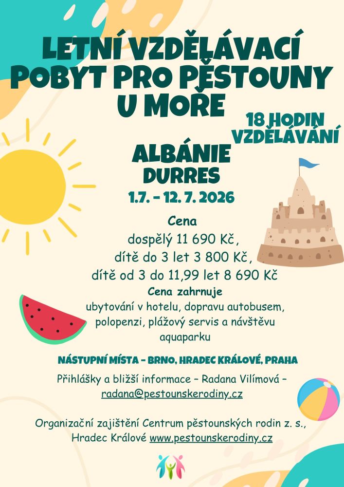 1. - 12. 7. 2026 - Albanie, Durres - Hotel Globo - 18 hodin vzdělávání, možnost čerpání respitní péče. Hlásit se můžete Radaně Vilímové na mail radana@pestounskerodiny.cz